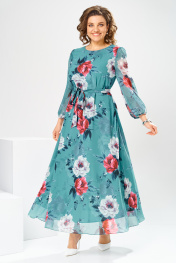 Платье женское относится к нарядной торжественной одежде. Платье женское отрезное по линии талии, расширенное к низу, длинное. Верхняя часть переда с 2-мя нагрудными вытачками, нижняя часть цельнокроеная. Верхняя часть спинки с 2-мя таллиевыми вытачками, с обработанным разрезом по головине, фиксирующимся на 1-ну навесную петлю и 1-ну пришивную пуговицу; нижняя часть спинки цельнокроеная. Горловина круглая, обточная, без воротника. Рукав втачной одно шовный, длинный. Рукав со сборкой по окату. Низ рукава собран на эластичную тесьму. Платье на подкладке. Платье без плечевых накладок. К платью прилагается съёмный пояс. Длина спинки платья 137 см, длина рукава 55 см.
