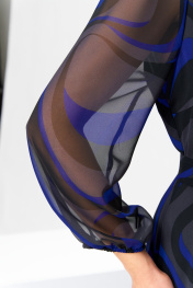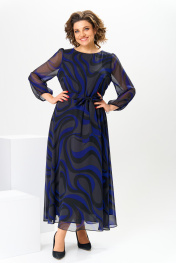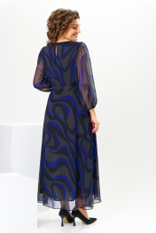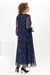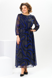 Платье женское относится к нарядной торжественной одежде. Платье женское отрезное по линии талии, расширенное к низу, длинное. Верхняя часть переда с 2-мя нагрудными вытачками, нижняя часть цельнокроеная. Верхняя часть спинки с 2-мя таллиевыми вытачками, с обработанным разрезом по головине, фиксирующимся на 1-ну навесную петлю и 1-ну пришивную пуговицу; нижняя часть спинки цельнокроеная. Горловина круглая, обточная, без воротника. Рукав втачной одно шовный, длинный. Рукав со сборкой по окату. Низ рукава собран на эластичную тесьму. Платье на подкладке. Платье без плечевых накладок. К платью прилагается съёмный пояс. Длина спинки платья 137 см, длина рукава 55 см.