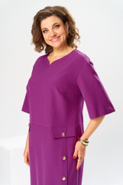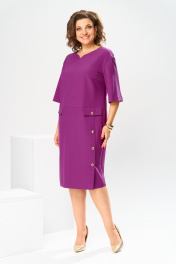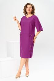 Платье женское, предназначено для повседневной носки. Платье женское, полу прилегающего силуэта, длиной за колено. Перед отрезной, ниже линии талии на 6 см; верхняя часть переда с 2-мя нагрудными выточками и средним швом, нижняя часть с отрезным бочком, шов соединения ею с передом, заканчивается шлицей, фиксирующейся на 3-и обмётанные петли и 3-и пришивные пуговицы; шов соединения часть переда декорирован 2-мя клапанами с закруглёнными концами закреплены на перед пришивными пуговицами. Спинка отрезная ниже линии талии на 6 см; верхняя часть с 2-мя таллиевыми вытачками и средним швом, нижняя часть с 2-мя таллиевыми выточками. Горловина с фигурным вырезом, обтачная без воротника. Платье со спущенным плечом. Рукам втачной, одно шовный, длиной за локоть. Платье без плечевых накладок. Длина спинки 105 см. Длина рукава+плечо 48 см.