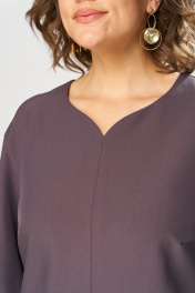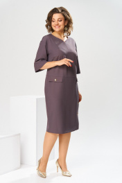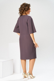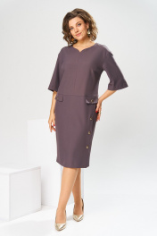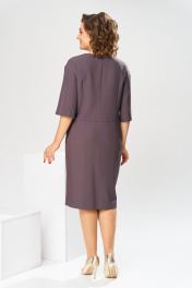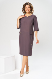 Платье женское, предназначено для повседневной носки. Платье женское, полу прилегающего силуэта, длиной за колено. Перед отрезной, ниже линии талии на 6 см; верхняя часть переда с 2-мя нагрудными выточками и средним швом, нижняя часть с отрезным бочком, шов соединения ею с передом, заканчивается шлицей, фиксирующейся на 3-и обмётанные петли и 3-и пришивные пуговицы; шов соединения часть переда декорирован 2-мя клапанами с закруглёнными концами закреплены на перед пришивными пуговицами. Спинка отрезная ниже линии талии на 6 см; верхняя часть с 2-мя таллиевыми вытачками и средним швом, нижняя часть с 2-мя таллиевыми выточками. Горловина с фигурным вырезом, обтачная без воротника. Платье со спущенным плечом. Рукам втачной, одно шовный, длиной за локоть. Платье без плечевых накладок. Длина спинки 105 см. Длина рукава+плечо 48 см.