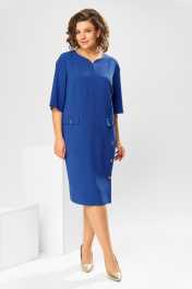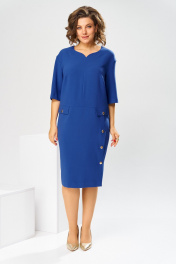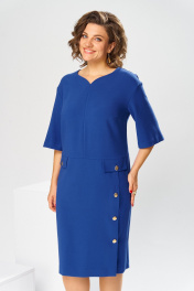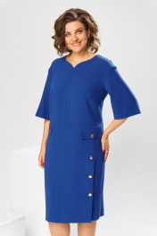Платье женское, предназначено для повседневной носки. Платье женское, полу прилегающего силуэта, длиной за колено. Перед отрезной, ниже линии талии на 6 см; верхняя часть переда с 2-мя нагрудными выточками и средним швом, нижняя часть с отрезным бочком, шов соединения ею с передом, заканчивается шлицей, фиксирующейся на 3-и обмётанные петли и 3-и пришивные пуговицы; шов соединения часть переда декорирован 2-мя клапанами с закруглёнными концами закреплены на перед пришивными пуговицами. Спинка отрезная ниже линии талии на 6 см; верхняя часть с 2-мя таллиевыми вытачками и средним швом, нижняя часть с 2-мя таллиевыми выточками. Горловина с фигурным вырезом, обтачная без воротника. Платье со спущенным плечом. Рукам втачной, одно шовный, длиной за локоть. Платье без плечевых накладок. Длина спинки 105 см. Длина рукава+плечо 48 см.