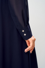 Платье женское может быть использовано как для повседневной носке, так и нарядная одежда. Платье женское, отрезное по линии талии, расширенное к низу, длинное. Верхняя часть переда с 2-мя нагрудными вытачками, с 2-мя вертикальными цельнокроенными планками, на правой части сформированная супатная застёжка на 5-ть вертикально обмётанных петель и 5-ть пришивных пуговиц; нижняя часть цельнокроенная. Верхняя часть спинки и нижняя без конструктивных особенностей. По шву соединения верхней и нижней частей платья (по линии талии) платье собрано на эластичную тесьму. Горловина круглая с втачным воротником, рубашечного типа с отрезной стойкой. Рукав втачной, длинный, одно шовный; низ рукава с 2-мя односторонними складками, с притачной манжетой, с застёжкой на 2-е обмётанные петли и 2-е пришивные пуговицы. Платье на подкладке. Платье с плечевыми накладками. К платью прилагается съёмный пояс с застёжкой на пряжку и 6-ть пробивных металлических блочек. Длина спинки пдатья 137 см, Длина рукава 63 см.