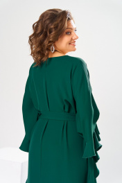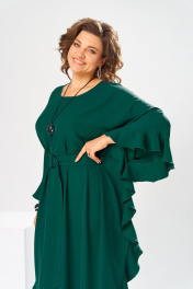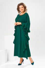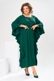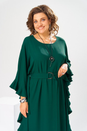 Платье женское, относится к нарядной торжественной одежде. Платье пончо свободного кроя, длинное. Перед цельнокроеный. Спинка со средним швом, вверху с разрезом, фиксирующимся по горловине на 1-ну навесную петлю и 1-ну пришивную пуговицу. Горловина круглая, обточная, без воротника, по переду горловины отделочная строчка 0,6 см. Рукав цельнокроеный удлинённый. Низ рукава и боковые швы декорированы приточной оборкой. По боковым швам зафиксирован уровень пройм и место расположения петель на уровне линии талии отделочными строчками. К платью прилагается съёмный пояс с пряжкой, фиксируемые на платье в петли на уровне линии талии. Платье без плечевых накладок. Длина спинки платья 132 см, ширина на уровне глубины проймы 66 см, ширина по линии талии 66 см, ширина плеча+длина рукава 56,5 см.