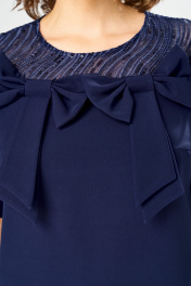 Платье женское относится к нарядной торжественной одежде. Платье женское, полуприлегающего силуэта, длиной за колено. Перед с 2-мя нагрудными вытачками, с отрезной кокеткой и отделочной ткани, переходящей из рукавов. Спинка с отрезной кокеткой из отделочной ткани, переходящей на рукав, с 2-мя таллиевыми вытачками, со средним швом, заканчивающимся шлицей. Горловина круглая, обточная без воротника. Застёжка на потайную тесьму-молнию в среднем шве спинки. Рукав втачной, одно шовный, длиной до локтя. Перед плятья по шву притачивания кокетки декорирован 4-мя настрочными бантами. Боковые швы с карманами. Платье без плечевых накладок. Длина платья по спинке 102 см, длина рукава 27 см.