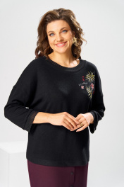 Костюм женский двух предметный: джемпер и юбка предназначен для повседневной носки. Джемпер прямого силуэта, длиной до линии бедер. Перед цельнокроеный, декорирован худ. Вышивкой. Спинка цельнокроеная. Горловина круглая, с втачной фигурной планкой из отделочной ткани. Джемпер со спущенной проймой. Рукав втачной, одно шовный, длиной 7/8. Юбка прямая, длиной ниже колена. Переднее полотнище с двумя боковыми фигурными карманами. Заднее полотнище с двумя таллиевыми вытачками. Застежка спереди на 8 металлических кнопок. Верхний срез с притачным поясом, с 4 надстрочными шлевками, между карманами и вытачками заднего полотнища пояс собран на эластичную тесьму. Юбка на подкладке. Длина джемпера 53см, длина рукава от горловины 58см. Длина юбки 68см