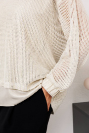 Комплект женский относится к торжественной одежде. Комплект женский 3-х предметный джемпер, топ и брюки. Джемпер прямого силуэта, с фигурным низом. Перед и спинка цельнокроеные, с притачной планкой из отделочной ткани по горловине. Джемпер со спущенным плечом. Рукав втачной, одно шовный, длинный, с притачной манжетой, собранной на эластичную тесьму. Джемпер без плечевых накладок. Топ женский прямого силуэта, длиной до линии бёдер. Перед с 2-мя нагрудными вытачками. Спинка цельнокроеная. Горловина круглая, без воротника. Проймы обтачные. Топ на подкладке. Брюки женские прямые широкие, длинные. Передние половинки с односторонними складками и карманами в боковых швах. Задние половинки с таллиевыми вытачками. Брюки с притачным поясом, собранным на эластичную тесьму, закреплённую 2-мя отделочными строчками.