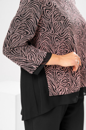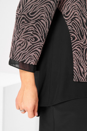 Костюм женский предназначен для торжественной носки: блузон и брюки. Блузон прямого силуэта, длиной до линии бедер с фигурным низом. Перед с двумя нагрудными вытачками. Спинка с отрезной кокеткой со средним швом, с бантовой складкой, переходящая на перед. Горловина круглая, обтачная, без воротника. Застежка на среднем шве кокетки спинки на одну навесную петлю и одну пришивную пуговицу. Рукав одношовный, длиной 7/8 с притачной отделочной деталью. Блузон с плечевыми накладками. Брюки прямые, слегка заужены книзу. Передние и задние половинки с талиевыми вытачками. Застежка на тесьму-молнию в среднем шве брюк. Верхний срез с притачным поясом, застегивающийся на одну обметанную петли и одну пришивную пуговицу. Длина спинки 77 см. Длина рукава 50 см. Длина брюк 103,5 см