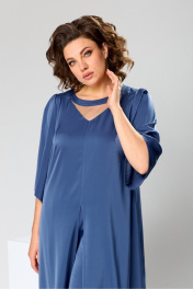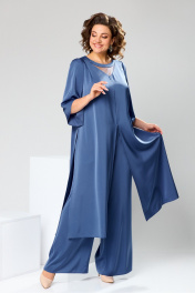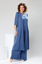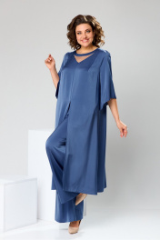 Комплект женский, относится к торжественной одежде. Комплект женский 2-х предметный туника и брюки. Туника женская, прямого силуэта, длиной до середины икры. Перед с 2-мя нагрудными вытачками, выходящими из плечевых швов, со средним швом, заканчивающимся разрезом, с отрезной планкой по горловине, с V-образной вставкой из отделочной ткани. Спинка со средним швом, заканчивающимся разрезом. Боковые швы с разрезами. Горловина круглая, обточная без воротника. Рукав втачной, одно шовной длиной 3/4 с фигурным низом и встречной складкой по центру оката. Туника без плечевых накладок. Брюки женские прямые, длинные. Передние половинки с карманами в боковых швах. Задние половинки с таллиевыми вытачками. Брюки с притачным поясом, собранным на эластичную тесьму, закреплённую 2-мя отделочными строчками. Длина спинки туники 119см, длина рукава 41 см. Длина брюк по боковому срезу 103 см.