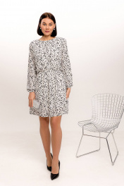 Платье прямого силуэта, длина выше колена, на подкладке. Отрезное по линии талии, со вставленой эластичной тесьмой,которая фиксирует платье на талии. Форма горловины - круглая. Рукава втачные длинные, собраны по низу на эластичную тесьму. Платье легкое, струящееся выполнено из ткани, в составе которой пэ 100%.