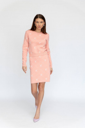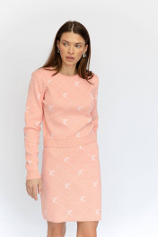 Костюм женский состоит из джемпера и юбки. Джемпер прямого силуэта, рукав втачной длинный. Горловина круглая, обработана прикетлеванной бейкой. Низ джемпера и низ рукавов связаны ластиком. Юбка прямого силуэта на широком поясе с ризинкой.Костюм изготовлен из пряжи, в составе которой хлопок 50%, ПАН 50%. Очень мягкий и нежный костюм подойдет для прохладной весны._x000D_