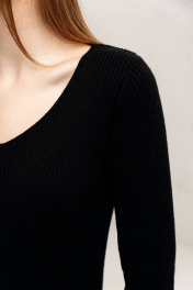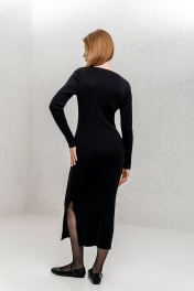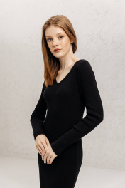 Платье прилегающего силуэта изготовлено из пряжи, в состав которой входит хлопок 50%, ПАН 50%. Рукав втачной длинный. Вырез горловины вывязан V-образной формы. .Платье очень мягкое и приятное к телу, вывязано переплетением "ластик 2*2" ._x000D_