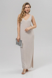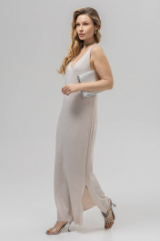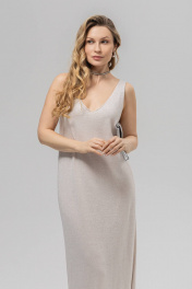Платье полуприлегающего силуэта с вывязанной V-образной формой горловины переда и спинки. Без рукавов. Пройма вывязана по контуру. Перед и спинка выполнены переплетением кулирная гладь. Платье изготовлено из пряжи, в составе которой хлопок 50%, ПАН 50% в сочетании с метанитом.Металлизированная нить в тон пряжи вплетена таким образом, что видна и блестит с лицевой стороны изделия ,придавая ему нарядность.