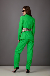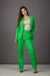 Комплект из костюмной ткани на подкладке, состоящий из жакета и брюк. Жакет приталенного силуэта с прорезными карманами с клапанами по переду. Воротник-английский, рукава - двухшовные. Застегивается на две пуговицы. Брюки прямого силуэта с наклонными карманами и поясом. Величина пояса регулируется резинкой. Застегиваются на молнию пуговицу по переду.