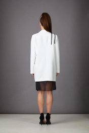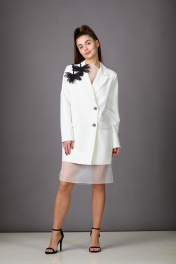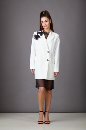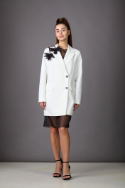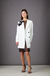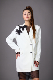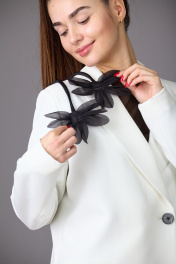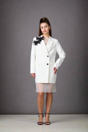 Ах, какая находка - жакет из костюмной молочной ткани с нежными ромашками-брошами! Жакет на подкладке прямого силуэта с двубортной застежкой, прорезными карманами с клапанами и воротником пиджачного типа. Рукава двухшовные, длинные. Идеален для комплектов с платьями- комбинациями, юбками, брюками. Длина жакета 44-48р - 82см , 50-54р- 84см