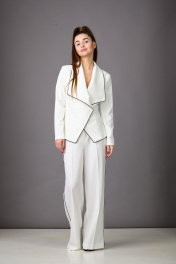 Стильная новинка на весну, несомненный хит будущего сезона- комплект из теплой молочной ткани с геометрией шикарного черного канта. Лаконичный жакет полуприталенного силуэта с воротником "апаш". Рукава двухшовные, длинные. Застежка на пришивные кнопки. Брюки широкие, со средней посадкой, с кантом по бокам. В поясе резинка для корректировки объема. Длина брюк-113см (44-46р), 113,5см (48-50р), 114см (52-54р)