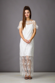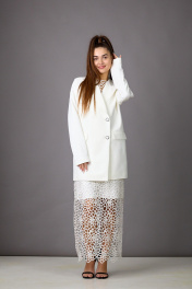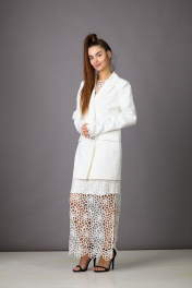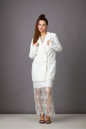 Комплект-тройка, состоящий из жакета, платья и нижнего платья. Двубортный жакет из костюмной ткани на подкладке. Воротник-с отложными лацканами пиджачного типа, рукава – двухшовные. По переду - прорезные карманы с клапанами. Застегивается на 2 пуговицы и одну потайную. Платье из кружева прямого силуэта с вытачками по переду. Рукава короткие. Нижнее платье- комбинация из плотного атласа. Крой по косой. Нижнее платье можно использовать как самостоятельное изделие. Длина платья из кружева-135см, длина рукавов-19см, длина нижнего платья-80-85см