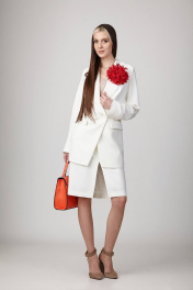 Комплект, состоящий из жакета и юбки из костюмной ткани на подкладке. Двубортный жакет полуприталенного силуэта с отрезными бочками и вытачками по переду и спинке. Воротник-с отложными лацканами пиджачного типа. По переду - прорезные карманы с клапанами. Рукава длинные, двухшовные. Жакет застегивается на две пуговицы. Жакет декорирован брошью ручной работы в виде хризантемы красного цвета. Юбка прямая с наклонными карманами и разрезом по переду , с широким поясом-обтачкой. Застегиваются на молнию сзади. Цвет молочный.