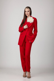 Брючный комплект из костюмной ткани на подкладке. Двубортный жакет полуприталенного силуэта с отрезными бочками и вытачками по переду и спинке. Воротник-с отложными лацканами пиджачного типа. По переду - прорезные карманы с клапанами. Рукава длинные, двухшовные. Жакет застегивается на две пуговицы. Жакет декорирован брошью ручной работы молочного цвета в виде хризантемы. Брюки узкие, с двумя карманами и поясом-обтачкой. Застегиваются на молнию по переду и одну пуговицу. Цвет красный.