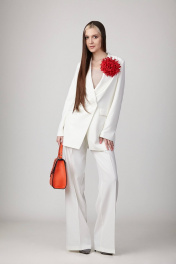Брючный комплект из костюмной ткани на подкладке. Двубортный жакет полуприталенного силуэта с отрезными бочками и вытачками по переду и спинке. Воротник-с отложными лацканами пиджачного типа. По переду - прорезные карманы с клапанами. Рукава длинные, двухшовные. Жакет застегивается на две пуговицы. Жакет декорирован брошью ручной работы в виде хризантемы красного цвета. Брюки прямые со складкой, широким поясом-обтачкой, наклонными карманами. Застегиваются на молнию по переду и пуговицу. Цвет молочный.