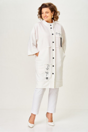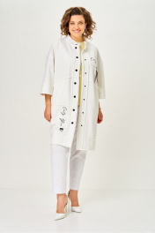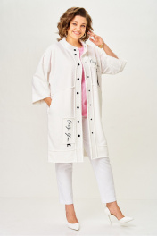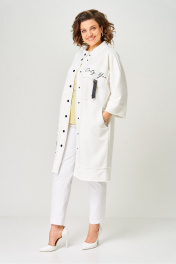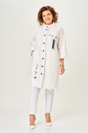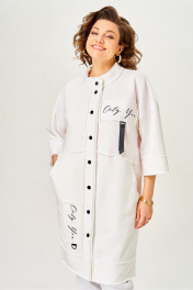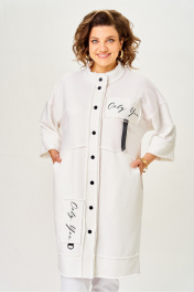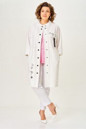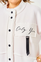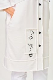 Кардиган женский прямого силуэта из трикотажной ткани (трехнитка-футер). На полочке и спинке расположены декоративные, необработанные швы. В верхней и нижней части переда есть настрочные элементы с печатью и тесьмой. По переду изделия карманы. Спинка со средним швом и кокеткой. На кокетке расположен элемент с печатью и тесьмой. Рукав спущенный с манжетой. Вырез горловины оформлен стойкой. По переду изделия планка с кнопками. Промеры на примере 52 размера: ОГ - 122 см (спущенное плечо), ОБ - 122 см. Длина изделия: 98 см ±1.0 Длина рукава от основания шеи: 59 см ±1.0 см
