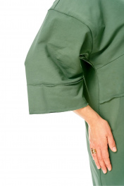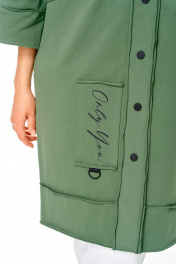 Кардиган женский прямого силуэта из трикотажной ткани (трехнитка-футер). На полочке и спинке расположены декоративные, необработанные швы. В верхней и нижней части переда есть настрочные элементы с печатью и тесьмой. По переду изделия карманы. Спинка со средним швом и кокеткой. На кокетке расположен элемент с печатью и тесьмой. Рукав спущенный с манжетой. Вырез горловины оформлен стойкой. По переду изделия планка с кнопками. Промеры на примере 52 размера: ОГ - 122 см (спущенное плечо), ОБ - 122 см. Длина изделия: 98 см ±1.0 Длина рукава от основания шеи: 59 см ±1.0 см