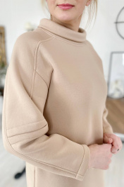 Платье женское из трикотажной ткани (футер с начесом), спортивного стиля. В боковых швах расположены карманы. Рукав - реглан с подрезными элементами. Горловина обработана стойкой-хомутом. Промеры на примере 52 размера: ОГ-116, ОТ-114, ОБ-118 Длина изделия по спинке 118 ± 1 см. Длина рукава от крайней точки шеи 68 ± 1 см.