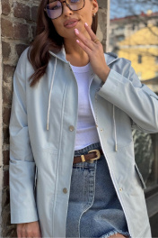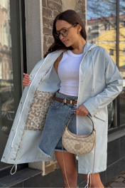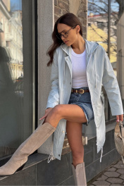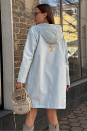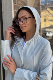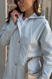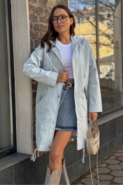 Куртка женская из текстильной ткани (водоотталкивающая) прямого силуэта. По переду расположены декоративные подрезы с прорезными карманами. Спинка состоит из 2-ух частей. На верхней части расположена кокетка и настрочной элемент (возможно изменение элемента-нашивки). Нижняя часть со средним швом. Спущенное плечо, рукав прямой. Вырез горловины оформлен капюшоном с блочками и шнуром. Куртка с планкой, застегивается на молнию и кнопки. По низу изделия расположен шнур с наконечниками. Промеры на примере 52 размера: ОГ 128 см, ОБ - 128 см. Длина рукава от крайней точки шеи: 75 см. Длина по спинке: 93 см. Рост модели на фото 170 см. На модели надет 42 размер.