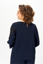 Блузка женская из текстильной ткани с цельнокроеным рукавом. Прямого силуэта. По переду блузки настрочена аппликация. По спинке расположен средний шов. Рукав 3/4, низ рукава с манжетой. Вырез горловины круглый, обработан обтачкой. Блузка застегивается на петлю-пуговицу. Длина изделия: по спинке 64+-1см Длина рукава: от крайней точки плеча 57 см. Промеры на примере 52 размера ОГ-120 см (спущенное плечо) ОБ- 124 см (прямого силуэта)