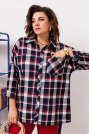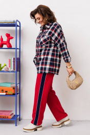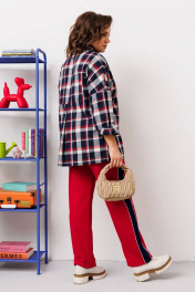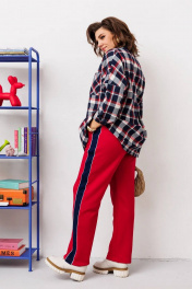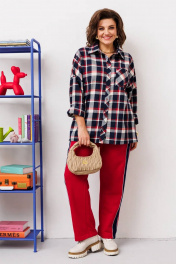 Стильный женский комплект свободного кроя. Рубашка выполнена со спущенной линией плеча. Задняя нижняя часть рубашки со встречной складкой по центру. Рукав с манжетой по низу одношовный. По переду накладной карман. Застежка на планку с пуговицами. Брюки прямые на поясе с резинкой. По бокам лампасы из контрастной ткани.