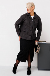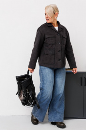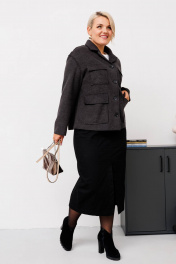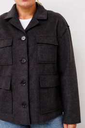 Жакет со спущенным плечом, с одношовным рукавом и воротником на подкройной стоке. Верхняя часть переда жакета с центрально бортовой застежкой на кнопки, нижняя часть с вертикальными вытачками, образующими о-образный силуэт низа. Застежка центральная бортовая на пуговицы до линии перегиба лацкана. Перед с накладными рабочими карманами и клапанами.