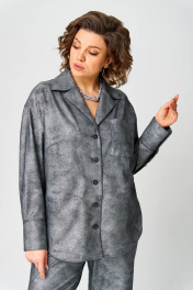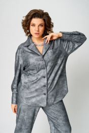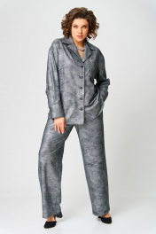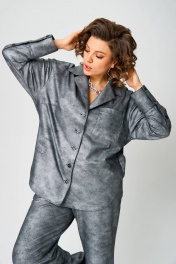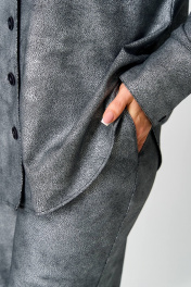 Комплект женский состоит из рубашки и брюк прямого силуэта со спущенной линией плеча, с застежкой на пуговицы. Рукав на манжете со складкой. Спинка с кокеткой и складкой по центру. Брюки на резинке, с карманами в боковых швах. Ткань эластичная, приятная к телу. Тонкий трикотаж с напылением