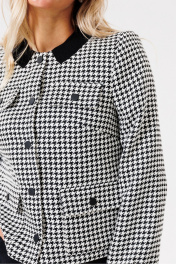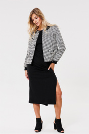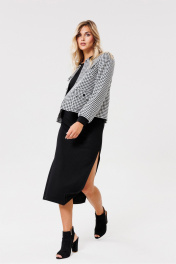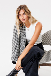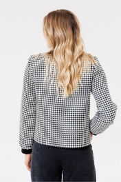 Жакет женский-бомбер на подкладке из текстильной ткани прямого силуэта. По переду расположены нагрудные вытачки, с накладными карманами и клапанами. Рукав прямой одношовный. Низ рукава со сборкой, оформлен манжетой. Вырез горловины оформлен довязом. Застежка жакета на кнопках. Промеры на примере 42 р.: Длина изделия по спинке 53 см. ОГ - 96 см. Ширина по низу 100 см. Длина рукава с учетом манжеты 60 см. Рост модели на фото 170 см.