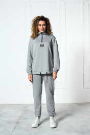 Костюм женский из трикотажной ткани(футер 3-х нитка), состоящий из брюк и свитшота. Свитшот прямого силуэта со спущенным плечом. Горловина оформлена стойкой на застежке «молния». Рукав втачной одно-шовный, низ рукава на подгибке с резинкой. Низ изделия на притачной манжете с люверсами и шнурком. Брюки прямого свободного кроя с боковыми карманами в шве . Пояс брюк резинка со сборкой. На полочке по центру в верхней части и на левой передней половинке брюк декор-нашивка. Декор может меняться в редком случае, но не в ущерб внешнему виду изделия!