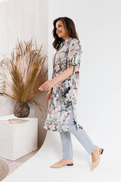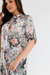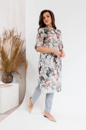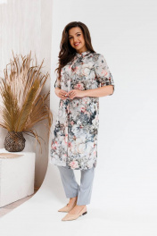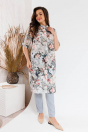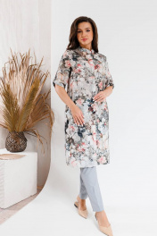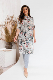 Модный костюм, состоящий из удлиненного блузона-шазюбль и брюк. Модель прямого силуэта с модным принтом длиной чуть ниже колена, рукав втачной, его длина регулируется. Застежка в блузоне центральная потайная. Горловина круглой формы оформлена стойкой. В боковых швах разрезы. Брюки прилегающего силуэта длиной по щиколотку. Застежка на молнии и пуговице, по бокам карманы. Брюки на поясе, есть шлевки для вдевания ремня. Посадка брюк высокая, пояс на линии талии.