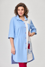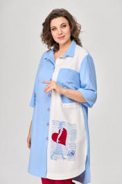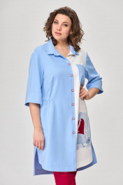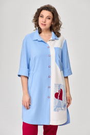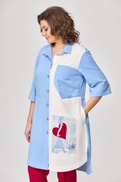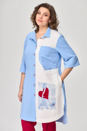Комплект женский состоит из шазюбля и брюк. Шазюбль женский из текстильной ткани прямого свободного силуэта, выполнен из двух видов ткани. Левая часть передней полки из однотонной ткани с нанесением нижней части рисунка - печати. В верхней части настрочной карман ассиметричной формы. По передней полке застежка на петли - пуговицы контрастного цвета. В шазюбле обработаны карманы в боковых швах. Горловина оформлена отложным рубашечным воротником на стойке. Спинка прямого силуэта с кулисой в области талии и шнурками. Линия плеча чуть спущена, рукав втачного покроя, одношовный. Низ рукава оформлен отложным широким манжетом. Низ шазюбля фигурной формы, округлен к бокам, перед короче спинки на 7 см. В боковых швах разрезы по 14 см. Брюки выполнены из текстильного полотна, прилегающего силуэта, зауженные к низу. На передних половинках застежка на тесьму - молнию. Задние половинки с талиевыми вытачками. Брюки по задней части - на эластичной резинке, по передней полке застежку на петлю-пуговицу.