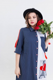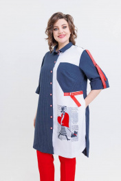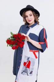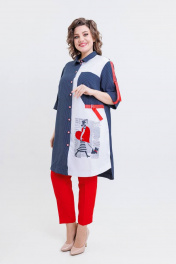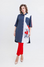 Комплект женский состоит из шазюбля и брюк. Шазюбль женский из текстильной ткани прямого свободного силуэта, выполнен из двух видов ткани. Левая часть передней полки из однотонной ткани с нанесением нижней части рисунка - печати. В верхней части настрочной карман ассиметричной формы. По передней полке застежка на петли - пуговицы контрастного цвета. В шазюбле обработаны карманы в боковых швах. Горловина оформлена отложным рубашечным воротником на стойке. Спинка прямого силуэта с кулисой в области талии и шнурками. Линия плеча чуть спущена, рукав втачного покроя, одношовный. Низ рукава оформлен отложным широким манжетом. Низ шазюбля фигурной формы, округлен к бокам, перед короче спинки на 7 см. В боковых швах разрезы по 14 см. Брюки выполнены из текстильного полотна, прилегающего силуэта, зауженные к низу. На передних половинках застежка на тесьму - молнию. Задние половинки с талиевыми вытачками. Брюки по задней части - на эластичной резинке, по передней полке застежку на петлю-пуговицу.