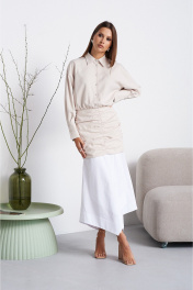 Платье женское, длинное. Верхняя часть сделана в виде рубашки и мини-юбки в сборку из струящейся ткани. Рукав спущенный, длинный с манжетой. Воротник стояче-отложгой. Нижняя часть платья выполнена из асимметричных элементов, которые образуют в платье длину макси.