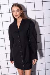 Платье приталенного силуэта, короткое, на подкладке, изготовлено из костюмной ткани. Рукав спущенный, длинный с декоративными пуговицами. Платье отрезное по талии, с декоративной баской, застёгивается на пуговицы по переду. Воротник акцентный(апаш) с декоративной тесьмой по контуру. Замеры: длина: 89см длина рукава: 60см