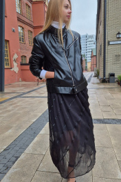 Куртка прямого, слегка приталенного силуэта. Рукав длинный, втачной, по низу расстёгивающаяся молния. Воротник - стойка с застёжкой на кнопку. Высота стойки - 6,0см. для всех размеров. Спереди застёжка на молнию. В рельефных швах расположены внутренние карманы. На левом переде - прорезной карман с молнией. Спинка куртки со средним швом и рельефами. Куртка на подкладке. Низ куртки оформлен поясом из кожзам и трикотажного "довяза." Длина изделия по центру спинки с поясом - 58,0 см. - для всех размеров. Высота пояса - 8,0 см. Длина рукава - 63,0 см. - для всех размеров. Ширина куртки на уровне груди (половина) - 44 р - 49,0 см., 46 р - 51,0 см., 48 р - 53,0 см. Ширина изделия на уровне низа ( половина) - 44 р - 51,0 см., 46 р - 53,0 см., 48 р - 55,0 см. Ширина рукава внизу - 44 р -12,0 см. (половина). 46 р -12,5 см., 48 р - 13,0 см. Ширина рукава вверху - 44 размер -16,5 см. ( половина), 46размер -17,5см., 48 размер - 18,5 см. (половина). Использована ткань производства Италии, 50 % ПЭ и 50 % вискозы. Предлагается модель для каждого и выходного дня.
