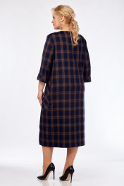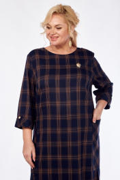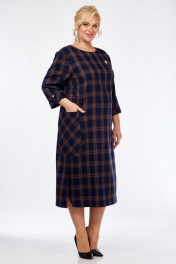 Силуэт полуприлегающий, расширенный к низу. Рукав втачной, одношовный. Внизу рукава выполнены отвороты, закреплённые патой с застёжкой на пуговицу. Длина рукава 45 см. Горловина закруглённая, на обтачке. Перед с нагрудными вытачками. На уровне бёдер по бокам расположены накладные карманы. Внизу боковых швов выполнены шлицы. Длина платья 118 см. Платье выполнено из ткани костюмно-плательной группы. 60 р. ПОГ 64, ПОБ 68