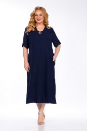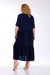 Силуэт полуприлегающий, расширенный к низу. Рукав втачной, одношовный. Внизу рукава выполнены отвороты, закреплённые патой с застёжкой на пуговицу. Длина рукава 27см. Горловина V – образной формы. По переду горловины вставлена перемычка, декорированная металлической пластинкой. Перед прямой. Спинка со средним швом, по линии талии отрезная. Нижняя часть спинки состоит из двух ярусов оборок со сборкой. На уровне линии бёдер в боковых швах выполнены потайные карманы. Длина платья по спинке123 см. Платье выполнено из лёгкой плательной ткани. 64 размер – ПОГ 68, ПОБ 82