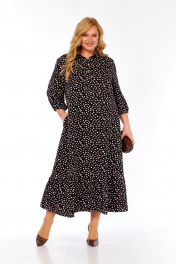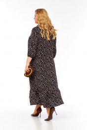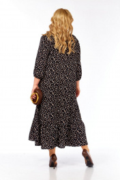 Силуэт полуприлегающий, расширенный к низу. Рукав втачной, одношовный, внизу выполнена сборка на тонкую резинку. Длина рукава 46 см. Горловина с отложным воротником на стойке, рубашечного типа. Перед с нагрудными вытачками. По центру горловины переда выполнена отрезная планка с застёжкой на две пуговицы. Спинка со средним швом. Низ платья декорирован отрезной оборкой, по которой выполнена сборка. Длина платья по спинке 135см. Платье выполнено из лёгкой плательной ткани. Обмеры 60 размера – ПОГ 65, ПОБ 75, длина изделия 129, рукава 46
