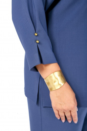 Силуэт полуприлегающий. Рукав цельнокроеный, «летучая мышь». Внизу по центру рукава закреплена встречная складка, дополнительно украшенная пуговицами. Длина рукава от горловины 55см. Горловина закруглённая, на обтачке. По центру переда застрочен защип (стрелка). Спинка со средним швом. Внизу боковых швов выполнены разрезы. Длина блузки по спинке 69см. Брюки прилегающие, спереди на молнии. Посадка стандартная. Пояс с резинкой по бокам. Длина брюк по боковому шву (без учёта пояса) 104 см. Комплект выполнен из костюмно-плательной ткани.