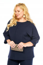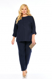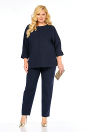 Силуэт полуприлегающий. Рукав цельнокроеный, «летучая мышь». Внизу по центру рукава закреплена встречная складка, дополнительно украшенная пуговицами. Длина рукава от горловины 55см. Горловина закруглённая, на обтачке. По центру переда застрочен защип (стрелка). Спинка со средним швом. Внизу боковых швов выполнены разрезы. Длина блузки по спинке 69см. Брюки прилегающие, спереди на молнии. Посадка стандартная. Пояс с резинкой по бокам. Длина брюк по боковому шву (без учёта пояса) 104 см. Комплект выполнен из костюмно-плательной ткани.