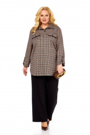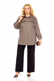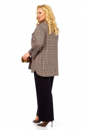 Силуэт полуприлегающий. Рукава втачные, одношовные. Низ рукава драпируется патой с застёжкой на пуговицу. Длина рукава 54 см. Горловина с отложным воротником, рубашечного типа. Перед с нагрудными вытачками и кокетками с застёжкой на две пуговицы. В шов притачивания кокеток закреплены клапаны, декорированные чёрным кантиком и пуговицами. Внизу боковых швов джемпер с закруглёнными разрезами. Длина джемпера по спинке 78см. Джемпер выполнен из трикотажного полотна. Брюки широкие, с поясом на резинке. Посадка стандартная. Длина брюк по боковому шву (без учёта пояса) 103 см. Брюки выполнены из костюмно-плательной ткани. 66 размер — ПОГ 72 ПОБ 74