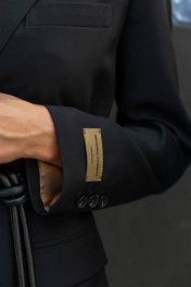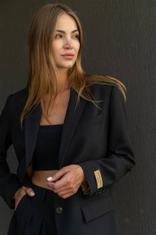Универсальный (базовый) трендовый жакет свободного силуэта, с цельнокроеными бочками, на подкладке. Воротник пиджачного типа с отложным лацканом, на левой полочке листочка. Спереди прорезные карманы в рамку с клапаном. Спинка со средним швом и высокой отлетной шлицей (40 см.). Рукав втачной , двухшовный, со шлицей и пуговицами. На левом рукаве настрочена декоративная бирка. Жакет создаст десятки новых стильных комбинаций и станет отличной долгосрочной инвестицией. Длина жакета по среднему шву спинки 77 см Длина рукава 62 см.