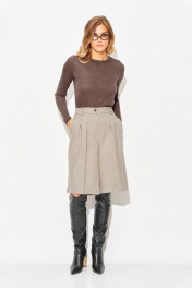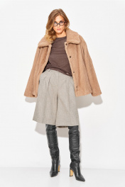 Шорты-бермуды свободного, прямого силуэта. На передних половинках заутюжены стрелки, переходящие в складки по линии талии. Застежка-гульфик, по переду боковые наклонные карманы. Пояс стабильный по переду, по задней части шорт на резинке, с настроченными шлевками и застежкой на пуговичку. Длина шорт по боковому шву с поясом 63 см. Ширина шорт по низу +-35 см. в полуобхвате.