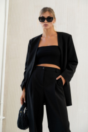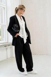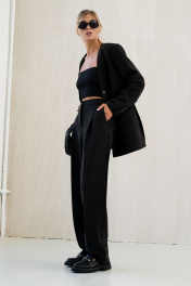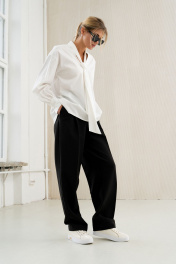 Брюки актуального силуэта, свободные, слегка заужны к низу. На передних половинках заутюжены стрелки, переходящие в складки по линии талии. Застежка-гульфик, по переду боковые наклонные карманы. Пояс стабильный по переду, по задней части брюк на резинке, с настроченными шлевками и застежкой на пуговичку. Длина брюк по боковому шву с поясом 108 см.