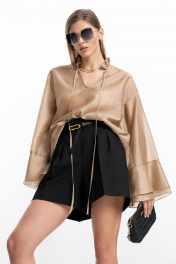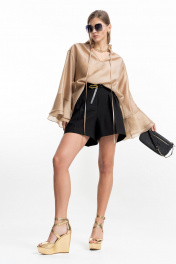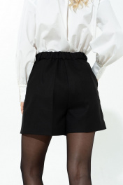 Шорты прямого силуэта. На передних половинках заутюжены стрелки, переходящие в складки по линии талии. Застежка-гульфик, по переду боковые наклонные карманы. Пояс стабильный по переду, по задней части шорт на резинке, с настроченными шлевками и застежкой на пуговичку. Длина шорт по боковому шву с поясом 41 см. Ширина шорт по низу +-36 см. в полуобхвате.