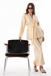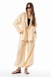 Брюки - "алладины", широкие, с поясом на резинке. Низ брюк собран на резинку. Карманы в боковых швах. Шелковистая ткань делает образ стильным и завораживающим. Брюки "алладины"- современный тренд благодаря сочетанию комфорта и стиля. Длина брюк с поясом +- 106 см Ширина брюк по низу до резинки в 44 р.+- 69 см. Обхват резинки по низу брюк в 44 р.: +-25 см. Параметры брюк в готовом виде в 44 р.: обхват талии 68 см, обхват бедер 102 см. На фото: жакет S-2637